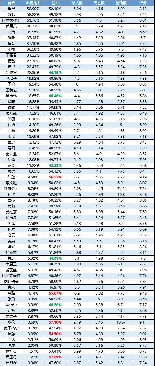 欢迎观看《曙光英雄》英雄周榜!新英雄贞德于上周登陆到游戏啦,虽然是辅助位,但登场率和胜率都很出彩,相信在未来经过大家的开发,可以和华佗抗衡:陆逊在重做之后胜率一直创新高,本周的榜单中进入前五;法修和刘备目前数据趋于稳定,已经成为了射手和争锋位的中流砥柱。雷震子在本周遗憾成为了避雷区的第一。 数据统计时间为:7月19日-7月25日 胜率前五:西王母、华佗、陆逊、法修、刘备 登场率前五:望舒、残影、阿