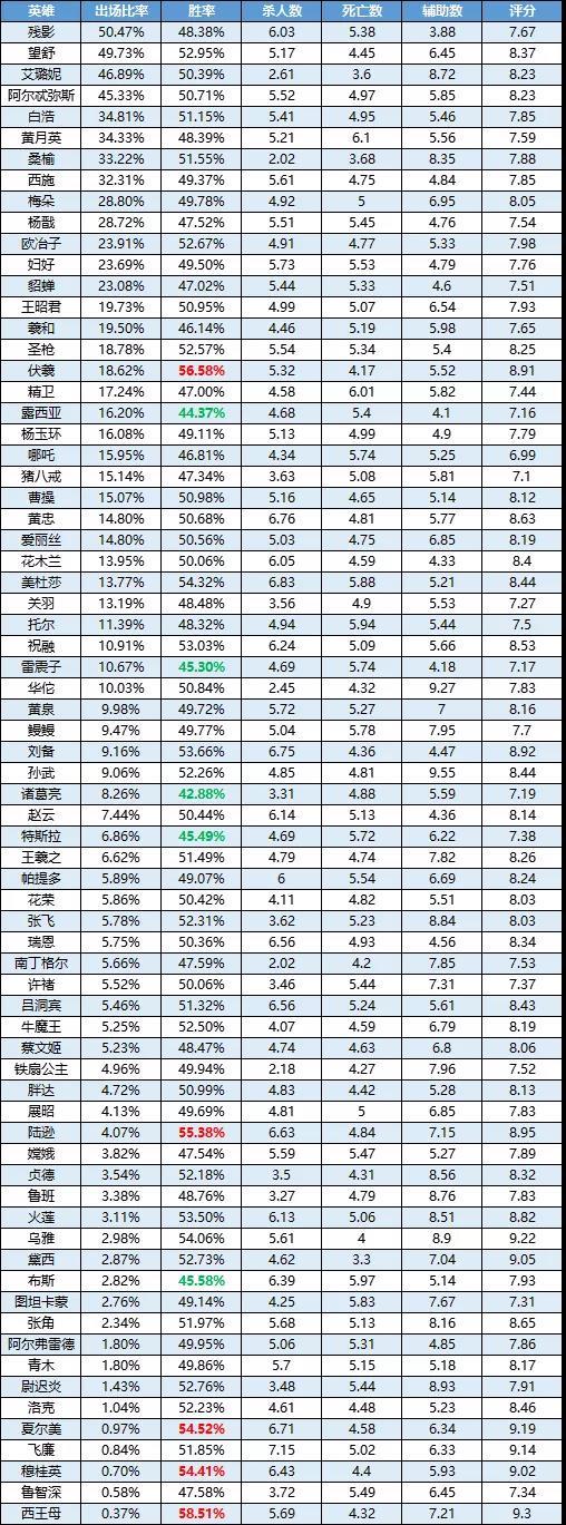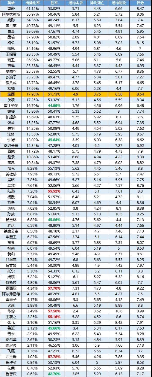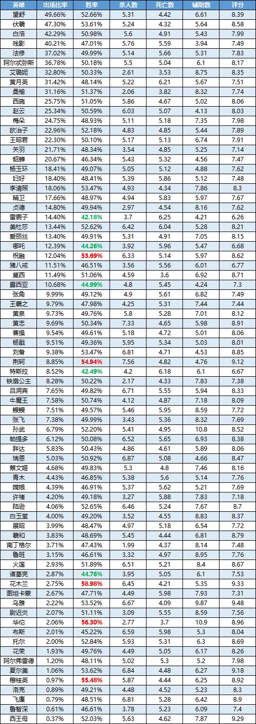 欢迎观看《曙光英雄》英雄周榜!刘备在近期的版本表现都不错,在伏羲被削弱后,刘备的闪光点再次被放大,成为了究极线霸。但是由于刘备是上个赛季的英雄,如今只能通过黑卡获取,导致玩的人还不是很多,所以登场率不高;乌雅可以通过逆天的大招来影响团战的走向,胜率目前排在第二;这次的避雷区,进行了一波大换血,但是好在胜率都没有低的很离谱,维持在45%-47%之间。 数据统计时间为:7月5日-7月11日 胜率前五: