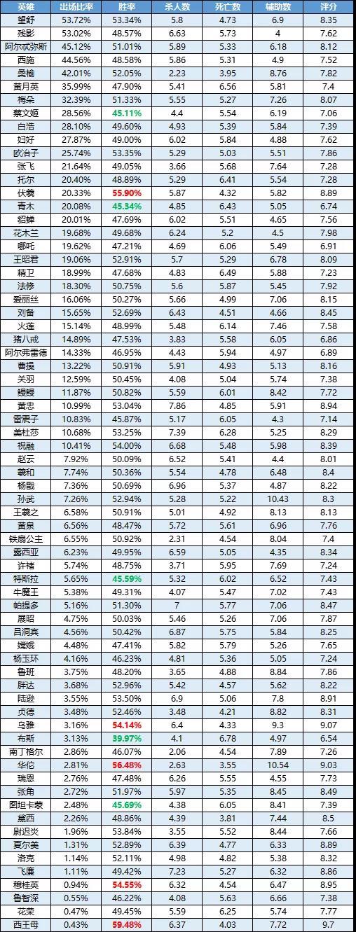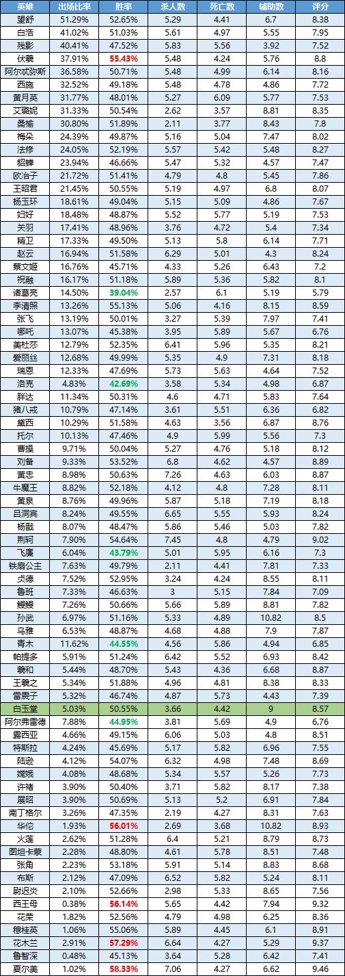 欢迎观看《曙光英雄》英雄周榜!本周的胜率榜单出现了很大变动,西王母往日神威已然不在,花木兰新王登基实至名归;荆轲也终于突出重围,数据相当华丽!凭借着高机动、高容错,胜率和登场率扶摇直上;李清照在削弱之后,进入一段低迷时期,在本周的榜单中表现良好;伏羲近期百分百参团,哪里都有他的身影;诸葛亮胜率略微提高,但45%的胜率还不能说明什么问题;新英雄白玉堂经历了一周多时间的拷打,胜率保持在50%左右,还不