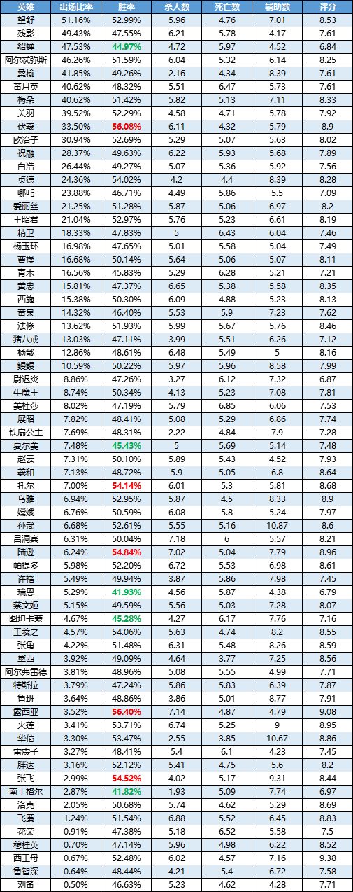 一周英雄榜单丨花木兰再登高位尽显本色;荆轲突出重围;洛克垫底难掩颓势