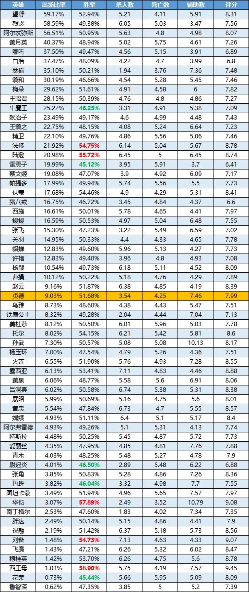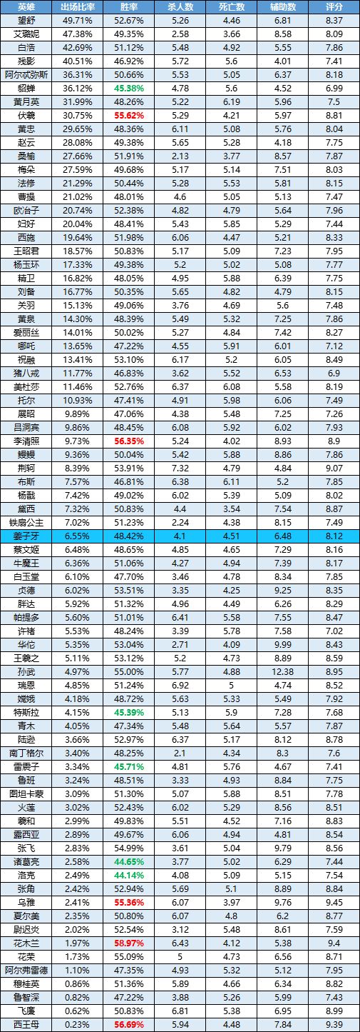 一周英雄榜单丨姜子牙首度亮相表现一般;花木兰依然霸榜;荆轲削弱后有所下滑