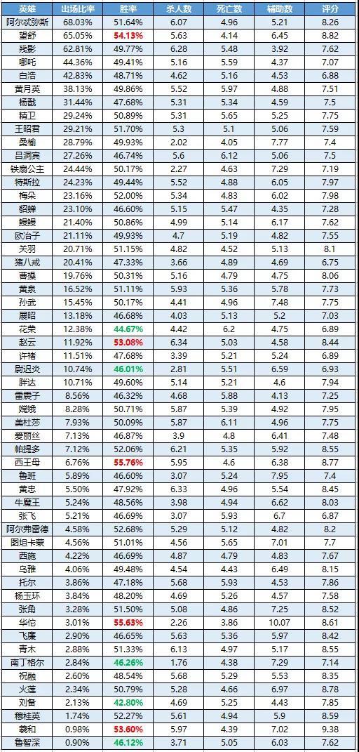 欢迎观看《曙光英雄》英雄周榜!上周新英雄姜子牙首亮相,但是根据数据来看,表现并不出众;西王母重回胜率榜前五,但出场率过低,导致样本不足,仍需观察;最近两周艾璐妮登场率直线上升!荆轲被削弱后,胜率有所下滑;花木兰、伏羲依然占据胜率榜两席; 貂蝉出场率尚可,但胜率不理想;诸葛亮加强后仍然没有太大改善,胜率相较上周反而更低了。 数据统计时间为:4月4日-4月10日 胜率前五:花木兰、西王母、李清照、伏羲