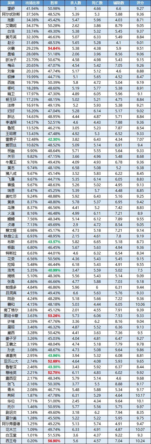 欢迎观看《曙光英雄》英雄周榜!上周,《曙光英雄》开启了全英雄畅玩的活动,一些平时出场率低的英雄得以重见天日。但一些英雄登场率提高了,胜率反而降低了,比如说常驻胜率榜第一的西王母,在本周的胜率榜当未进前五;强势打野露西亚,这次的胜率只有47.99%。伏羲、陆逊、望舒、法修这几个英雄,在活动期间依然保持着比较稳定的发挥;新英雄瑞恩继续“摆烂”,胜率最低,夏尔美上手门槛过高,因此胜率也出现了大幅度的下滑