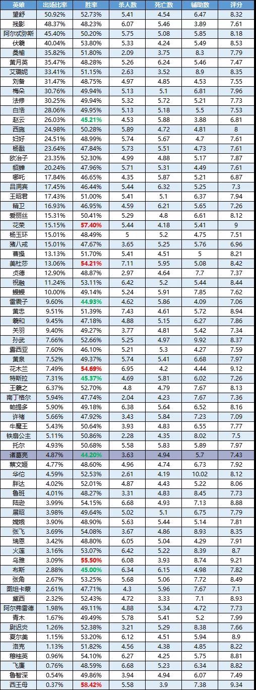 欢迎观看《曙光英雄》英雄周榜!本周的榜单可能有些注水的成分,诸葛亮的登场,让大家对这个英雄的评价两极分化。在数据上诸葛亮表现很糟糕,但实际上高玩手上的诸葛亮可以凭借着高机动性,将对手玩弄于股掌之中,具体该英雄的潜力如何,还需进一步观察;花木兰、美杜莎在最近的版本都属于版本强势英雄,苦于一直没有进入胜率前五,没有得到太大的曝光机会,这次终于如愿以偿;登场率方面艾璐妮上周昙花一现,本周跌出登场率前五,