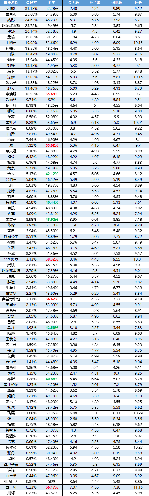 欢迎观看《曙光英雄》英雄周榜!马可波罗作为辅助在本周的数据不错!全分段胜率榜中占据一席;西王母在本周罕见两榜登顶,但依然面临样本不足的问题,只能说还是虚胖;通过综合数据来看,孙悟空、岚、白泽等英雄依然强势,想上分的小伙伴速度了!数据统计时间为:2月13日-2月19日模式:全模式(除人机)殿堂骑士以下段位榜单(不包含殿堂骑士段位)登场率前五:艾璐妮、黄月英、残影、阿尔忒弥斯、望舒胜率前五: