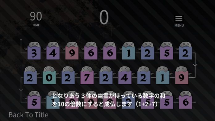 幽霊をドラッグして動かし、隣り合った3体の数字の和を10の倍数にして成仏させる計算パズルゲームです。