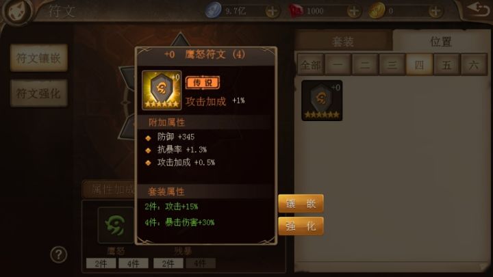 大扎好,我是小黑豆。从今天开始我会教给大家最出色的符文选择技巧。符文是我们最强的秘密武器,目前已知的符文品质分为1星-6星,星级越高,主副属性的起点越高,每次升级加成的数据也越高。符文分为主属性和附加属性两种,可以通过强化提升符文等级,每次升级都能提高主属性的数值,符文最高可以升级到+15 图1(6星1级符文) 图2(6星15级符文)另外每次+3、+6、+9、+12、+15时符文都能突破