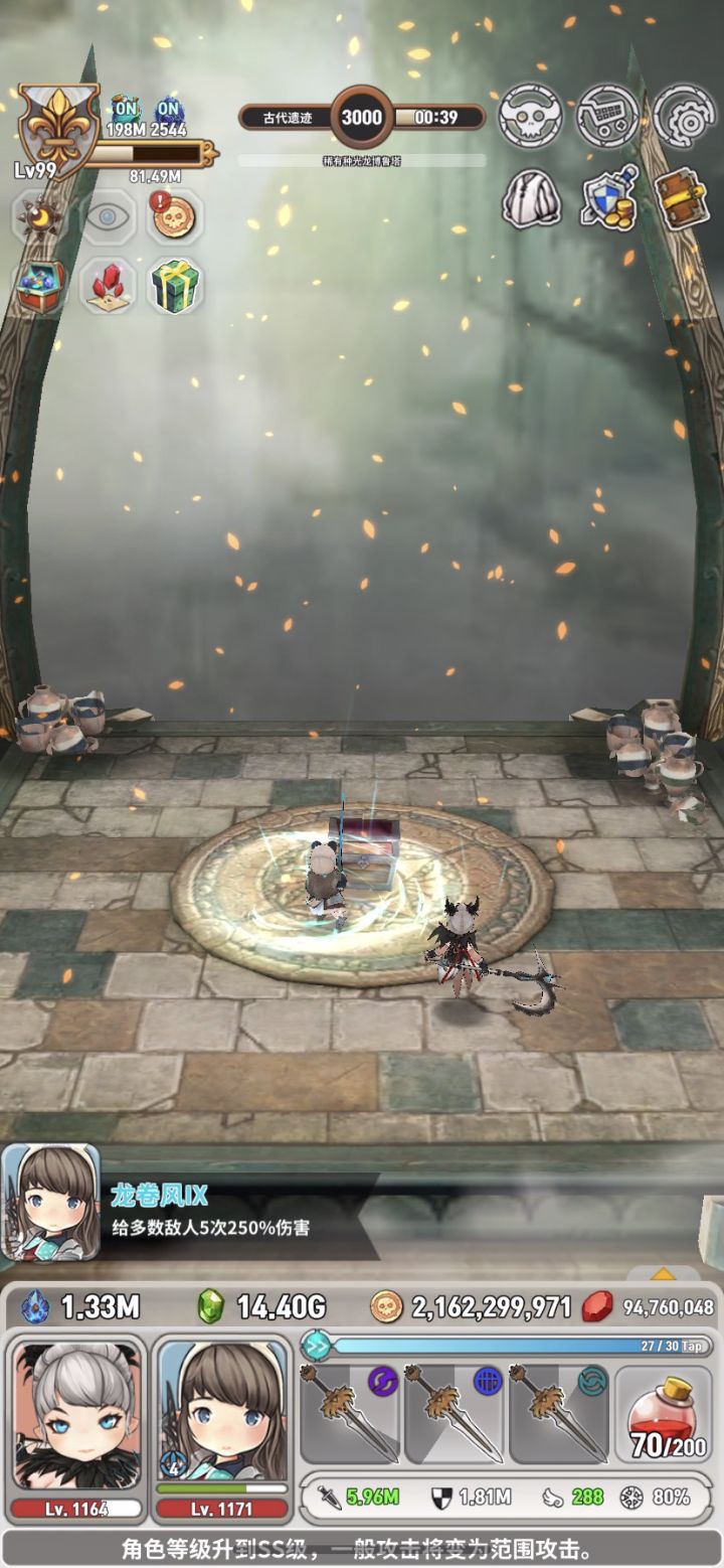 从2995层开始变得异常艰难,小怪都打半天😨第3000层的boss打了足足有3分钟多,复活了两次,第一次是被秒了(然后自己开始狂按血瓶),第二次是时间不够,不过最终还是磨过去了😌3000层结束后会出现动画强行回城最后再补充下自己的战力数据:冒险团等级99,主角评级SSS,等级1171,RANK723(血量防御各加100其余点数全加攻击了),除了特殊装备外其余均为神话级别,3把屠龙者(麻痹、