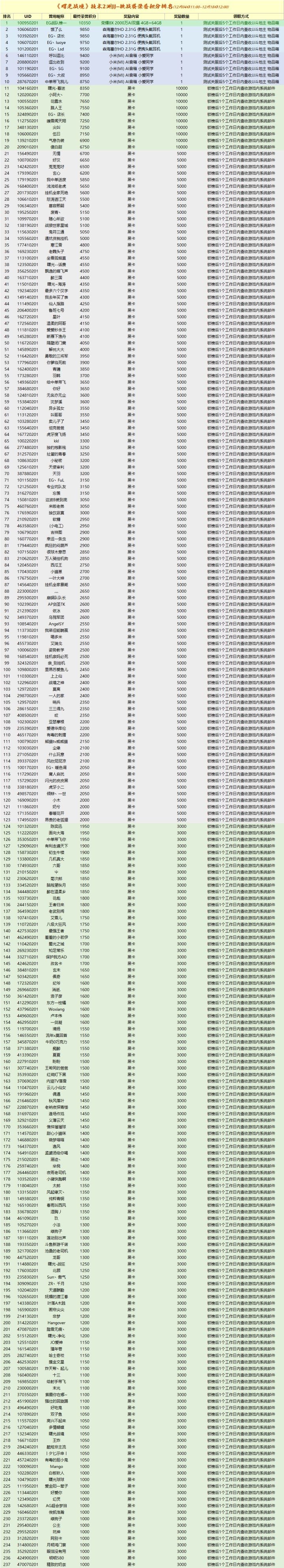 亲爱的各位玩家:《曙光战境》技术2测已于12月18日12:00关于JJ-挑战赛荣誉积分排行榜,后续计划如下:①JJ-挑战赛:荣誉积分排名已于12月18日12:00锁榜,具体排名见后续表格,我们将在1个工作日内安排黑卡奖励发放,实物奖励等测试关服后5个工作日内安排;②兑换中心:(黑卡)兑换中心计划将持续开放到12月21日18:00,还请各位玩家及时兑换自己的黑卡(记得要绑定账号);③测试关服