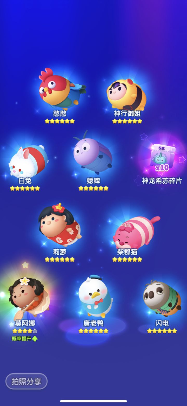 4日份的SSR碎片:爱丽丝x2、朱迪x3、辛巴x5、云妮x3、大白x2、毛怪x1、莫阿娜x1、米格x5、白雪x1、爱丽儿x2(其实一片来自扭蛋)、拉雅x2、胡迪x1、巴斯光年x14日份的小确幸:难得蹲盒子小暴击3天,顺便拿了个10连4日份的小沮丧:野兽差2片就能发了,怎么会这么难点💔🙏🏻🙏🏻🙏🏻拜托拜托!签到盒子让我开出胡迪\匹诺曹吧🙏🏻🙏🏻🙏🏻许愿扭蛋/普连/豪免多出未溢出的SSR,无需万