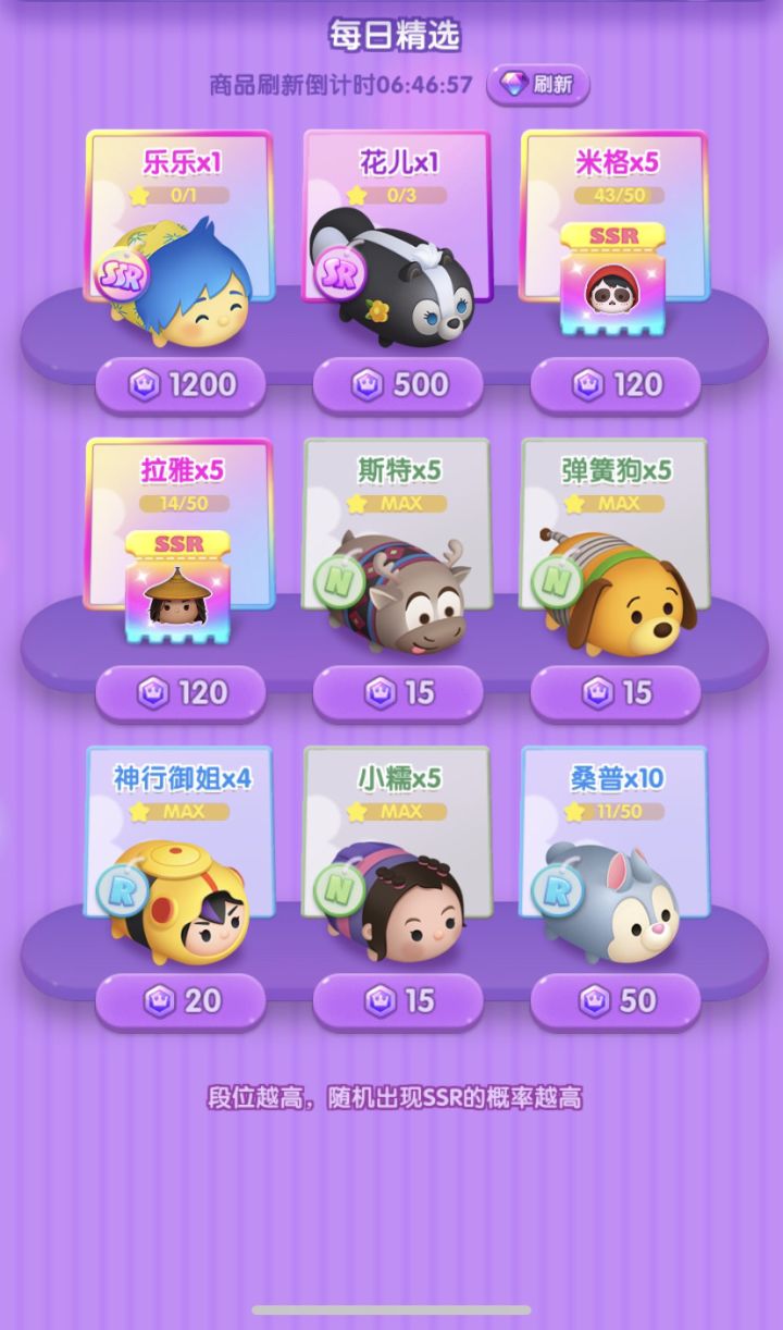 4日份的SSR碎片:爱丽丝x3、艾莎x2、朱迪x1、辛巴x1、野兽x1、云妮x1、史迪奇x1、大白x2、米格x1、乐佩x1、爱丽儿x1、灰姑娘x2、胡迪x2、巴斯光年x1、爱洛x1(扭蛋)、闪电麦坤x14日份的小确幸:扭蛋又出一枚SSR的碎片4日份的小沮丧:日常蹲盒子艰难💔🙏🏻🙏🏻🙏🏻拜托拜托!签到盒子让我开出胡迪\匹诺曹吧🙏🏻🙏🏻🙏🏻许愿扭蛋/普连/豪免多出未溢出的SSR,无需万能碎片的辅