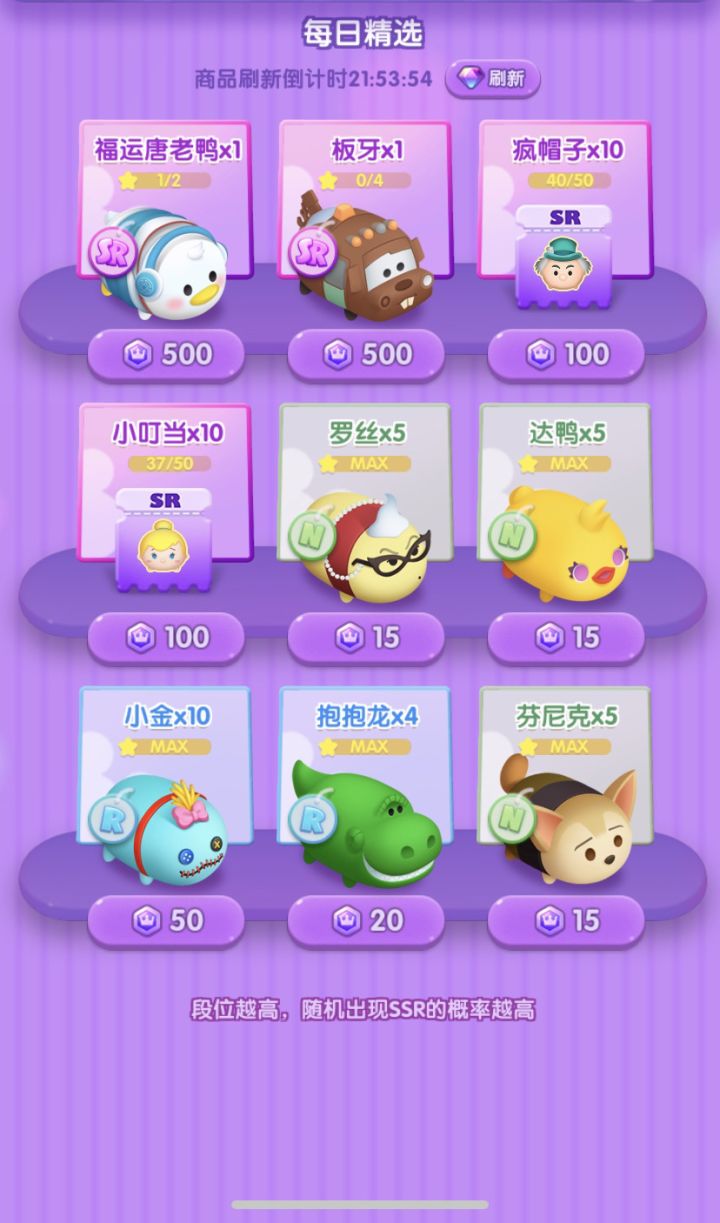 三日份的SSR碎片:爱丽丝x3、朱迪x1、辛巴x1、野兽x2、云妮x1、大白x1、白雪x1、木兰x3、爱丽儿x2、拉雅x1三日份的小确幸:🈚三日份的小沮丧:胡迪差2三星,直接万能合成送他三星毕业🙏🏻🙏🏻🙏🏻拜托拜托!签到盒子让我开出爱洛\乐乐\匹诺曹吧🙏🏻🙏🏻🙏🏻许愿扭蛋/普连/豪免多出未溢出的SSR,无需万能碎片的辅助即可合成🙏🏻🙏🏻🙏🏻日常顺利蹲取大大们发的SSR碎片🙏🏻🙏🏻🙏🏻挑战赛S