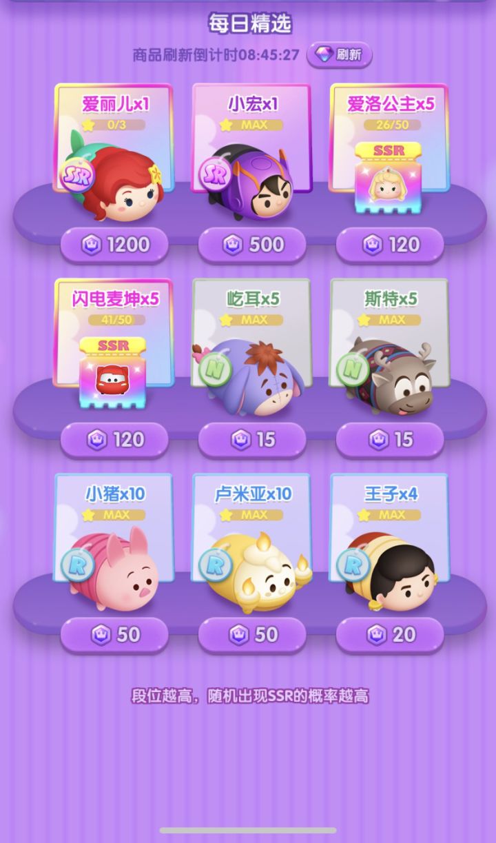 5日份的SSR碎片:爱丽丝x1、艾莎x3、朱迪x3、辛巴x2、野兽x1、云妮x12、毛怪x2、莫阿娜x1、木兰x3、乐佩x1、拉雅x3、胡迪x2、巴斯光年x2、闪电麦昆x1、灰姑娘x1、爱洛x15日份的小确幸:蹲盒子难得有10张SSR碎片暴击😭、万能碎片终于出5碎片暴击了🤧5日份的小沮丧:捞金鱼1300盒子开了溢出的大白,蹲盒子点击频率快慢完全不影响系统想不想给你碎片,简称全凭运气🤒🙏🏻🙏🏻