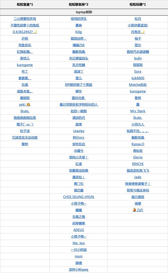 松松总动员taptap平台庆祝开服活动中奖名单来啦!感谢大家对松松的喜爱和支持,以下是本次活动中奖名单,恭喜小伙伴在本次活动中被随机抽中。【兑奖方式】请添加QQ兑换奖励:2101309671。添加时请备注【TapTap+账号昵称】作为审核条件~请中奖的小伙伴在7月15号前联系兑奖QQ。没被抽中的小伙伴也不要气馁哦,后续请持续多多关注taptap松松总动员专区,还会推出更多有趣的活动哦,祝大