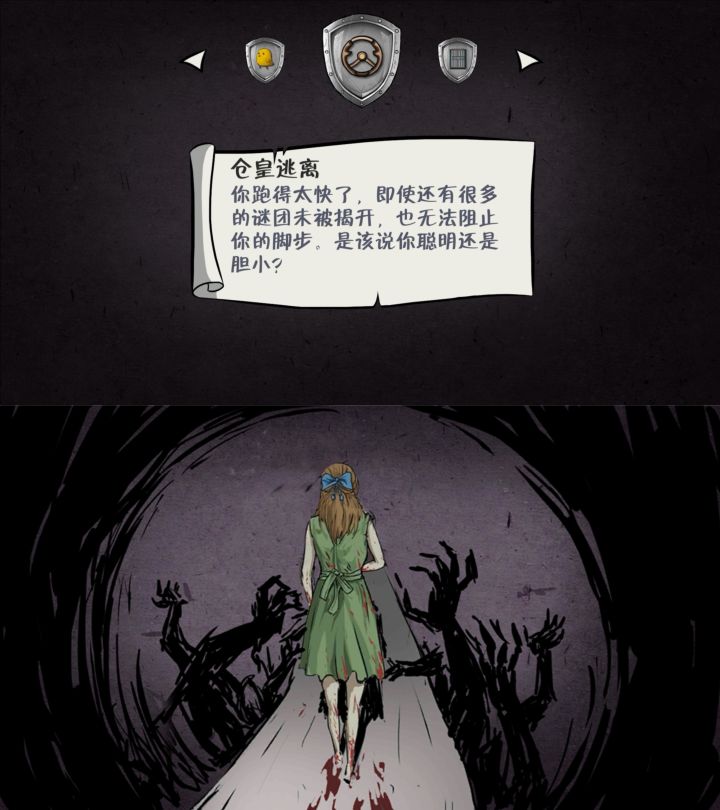 在我的不断尝试和思考下我可算把最后一个结局试出来了…前面我就不说了 提示都有 上头的攻略也有在拿到十字锥之后 千万不要点门!不要打开!不要打开!不要打开!不然只能重置游戏重来!拿到十字锥后 用金属框架 就是那个长条的玩意儿 点一下门 堵住他!然后跑回地下室!进入打开的暗门!就能够正常进入了!这里暂时只发现两个收集品 一个是上面的人可以点一下还有一个在中央祭坛上右下角的纸之后就可以返回大