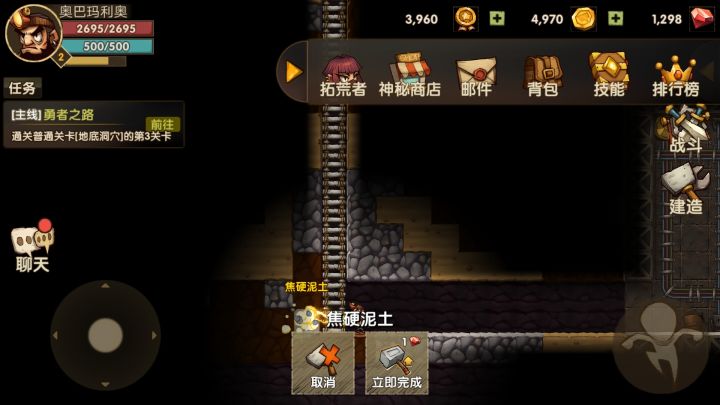 游戏画风不错,但是缺乏趣味性,非常耗时间。1.挖方块哪怕设计成读条也好,显示数字太佛系。消耗钻石可以跳过挖掘的设定,感觉有些坑,还不如后期出些强化挖掘道具,测试阶段可以理解,但是其它方面都没做好就先把氪金系统做好了,有点缺乏诚意。2.游戏的打击感非常差,怪物没有挑战性。技能设计的也没有什么特点(都是直接计算伤害),既然如此技能元素属性完全没必要。提点小建议:水系技能带击退效果,可以解火焰