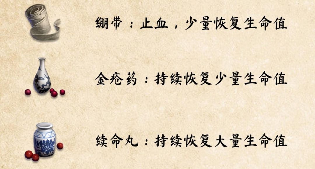 在武侠乂的世界里,厮杀不断,难免受伤,此时医疗和药物就必不可少了,在此主要讲讲怎么回血。 回血方式主要有三,1是药物治疗,2是武器吸血,3是心法回血。 1药物治疗,按药物的功能效果和稀有程度,私将药物分为三个等级,如下 基础药物:绷带,金疮药,续命丸。建筑内可寻 绷带使用时间为1秒,恢复少量;金疮药服用时间1秒,持续恢复少量;续命丸服用时间2秒,持续恢复大量。建议各携带6个左右。 高级药物: 大补