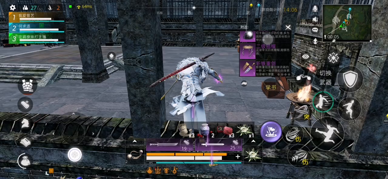 人在跳下来的时候被单剑戳中半空中死掉的,跳起来的时候能点击舔包,上去捡和下来捡都捡不到,只有跳在半空中点包里的东西能捡