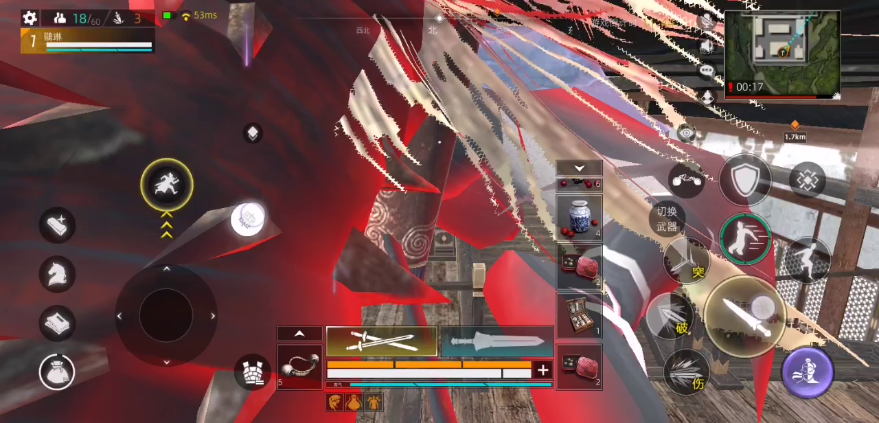 很明显人物动作有异常锁定的时候格挡出现的,严重的我没录,严重的就是两个人物重影来回闪烁