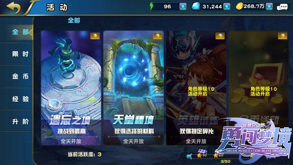 目前开放多个玩法活动功能,每次可持续挑战,持续获得收益。每个活动副本内容有不同的怪物与不同的地图组合,特殊的开启时间机制与道具限制玩法规则。核心道具的产出:指定英魂碎片、装备、英雄升阶道具、体力药水、大量英雄经验、高级传说装备的掉落。