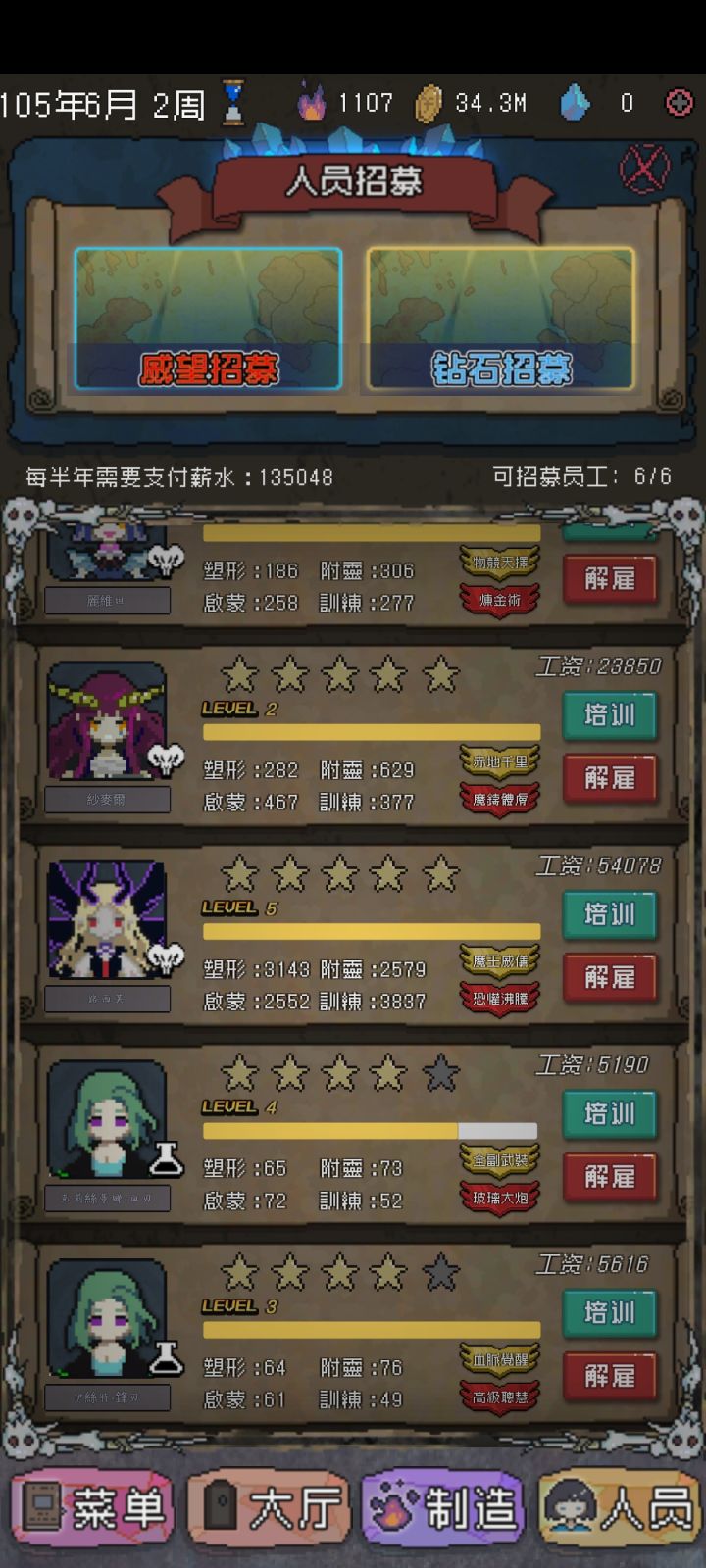 玩了几个小时 已经没有难度了前期小小苟一会 攒够几万金币 钻石招募 招募时看一下下面公告 在哪里容易得魔王 每个魔王起码得三万领回家 记得第一次招募时候一定要钱顿几万 以免发工资透支 都是泪 第一个号招到魔王红后人道毁灭了 钱多了就买商店材料一直吃 还有十月刷新神秘商店 能看几次广告 研究里面 强欲性格适配好几个类型的怪兽 就这些 很简单的小游戏