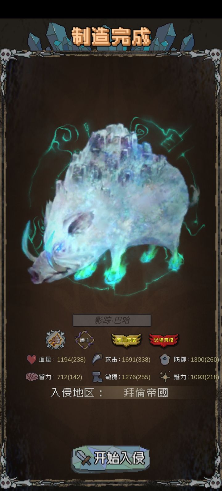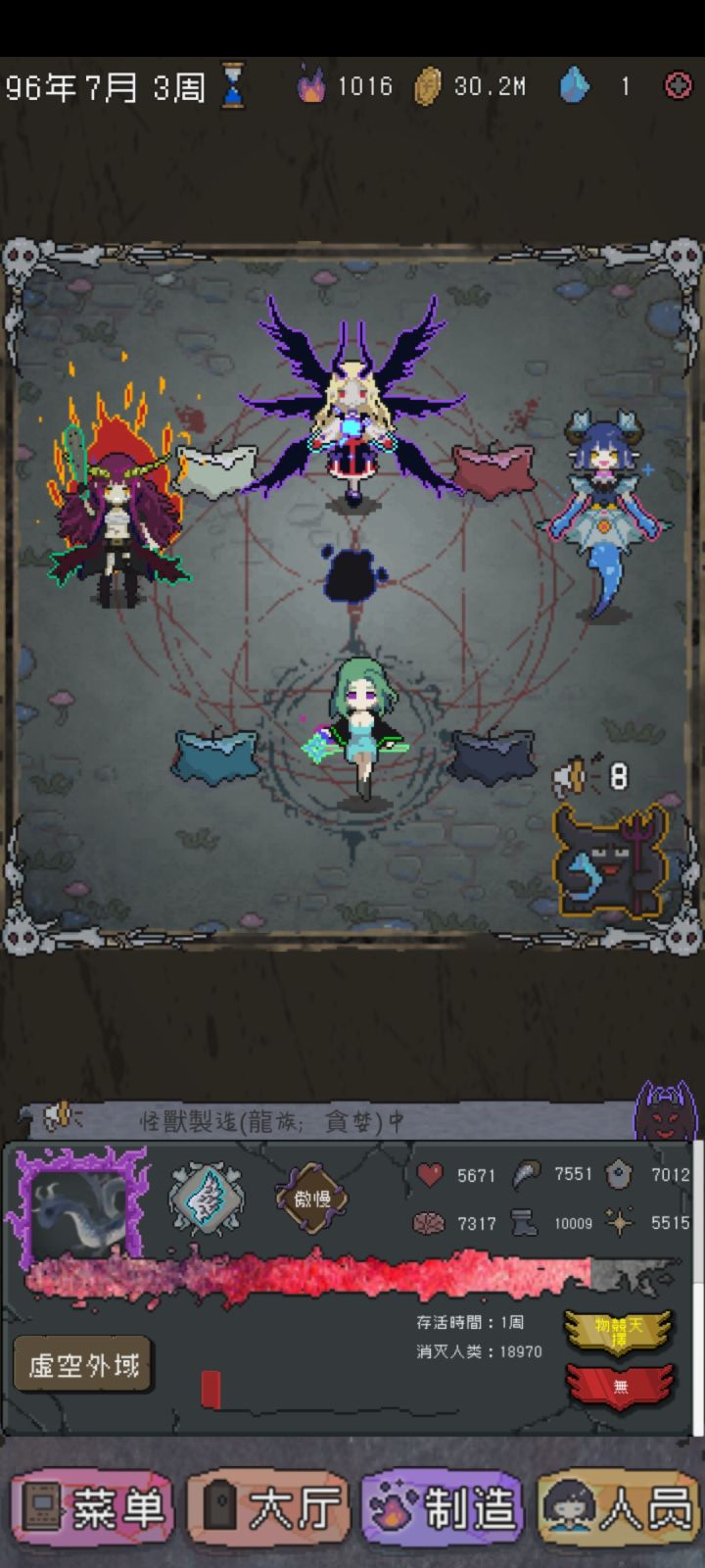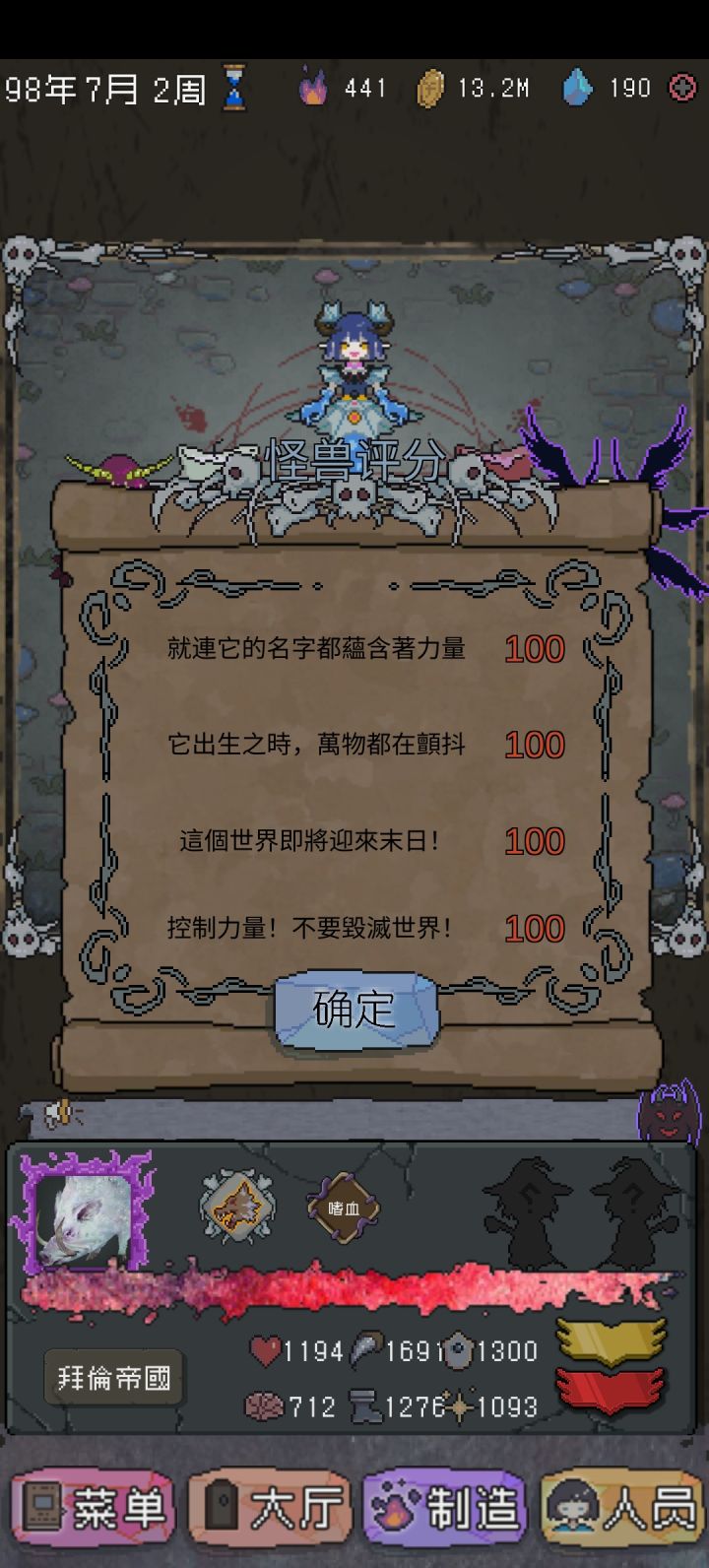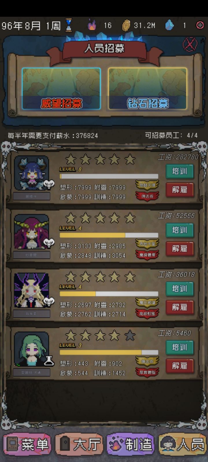 玩了几个小时 已经没有难度了前期小小苟一会 攒够几万金币 钻石招募 招募时看一下下面公告 在哪里容易得魔王 每个魔王起码得三万领回家 记得第一次招募时候一定要钱顿几万 以免发工资透支 都是泪 第一个号招到魔王红后人道毁灭了 钱多了就买商店材料一直吃 还有十月刷新神秘商店 能看几次广告 研究里面 强欲性格适配好几个类型的怪兽 就这些 很简单的小游戏