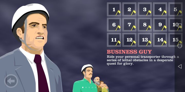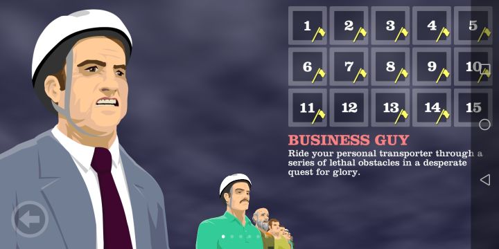 这游戏是真的可以,我没事的时候就会打开来玩一下,死了几次后就暴躁的把游戏关掉,但是过一下又重新打开来玩,我也不知道我是不是在找虐。期间有好几次都想删游戏,但是又舍不得已经过了的这些关卡,于是想全部通关后再删,可是估计得再过一阵子了,而且也不知道这游戏还会不会更新关卡。目前只有自行车父子和那个玩跳跳杆的(前阵子刚更新了三关),还有最后面可以选人的那四关全部过关,其他的还差一些。说实话,我觉得老头的最