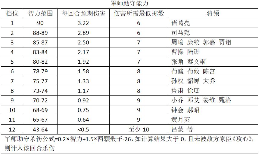 智力越高,伤害增幅越明显,诸葛亮为例:守方两个骰子掷出6就可以“军师杀伤”攻方1仟兵,平均下来每回合3.22仟。