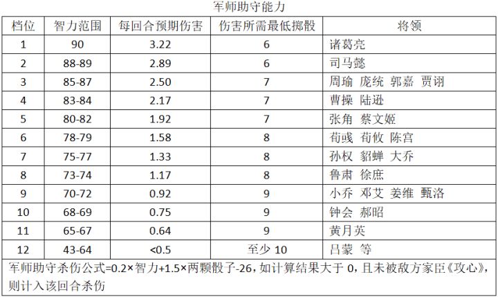 智力越高,伤害增幅越明显,诸葛亮为例:守方两个骰子掷出6就可以“军师杀伤”攻方1仟兵,平均下来每回合3.22仟。