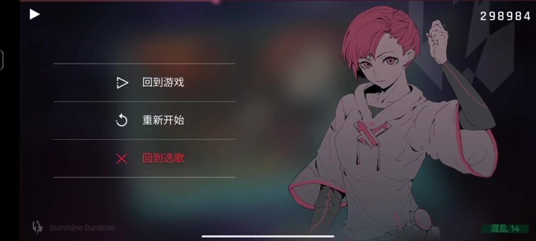 首先,老老实实地把新手教程过完,认识并尽可能地记住不同按键要怎么处理。 需要注意的是:向任意方向滑动的滑键只有混沌(CHAOS)和混乱(GLITCH)难度才有,对于新手而言不用刻意去记;你前中期需要处理的按键只有三种:单点、长按、滑锁链。 之后,带你认识一下界面: 如图,这是角色选择界面。 左下角的灰白按键点击后会退出到标题登录界面;红色按键点击后会进入黑市界面,黑市界面中左边是抽奖系统,右边是