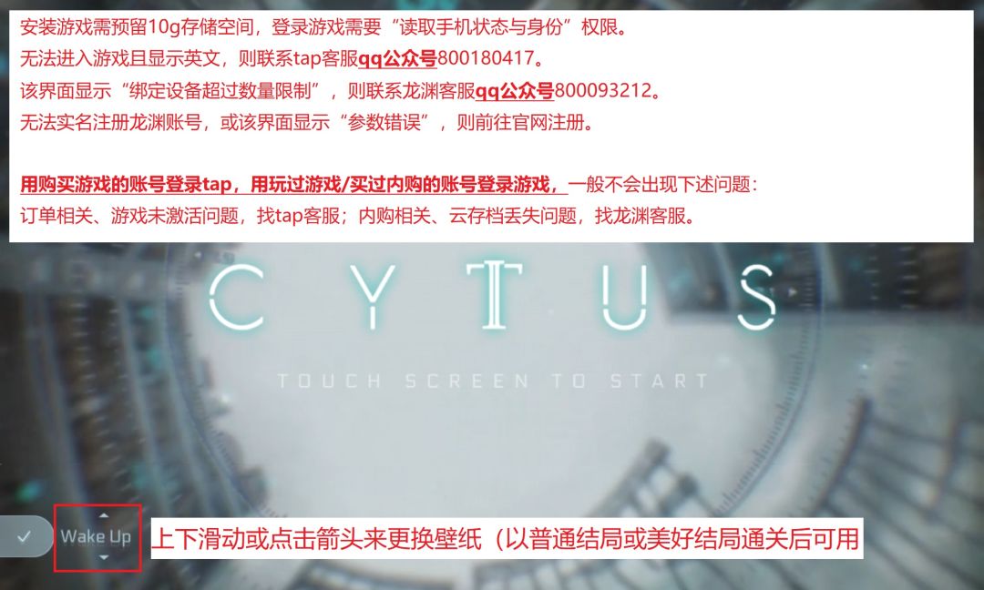 答疑: -3本体限时免费是什么意思? 本体限时免费,即游戏在限定时间内可以免费下载(0元购买),限免活动结束后也可以继续游玩(当然,Cytus2有付费DLC需另外购买)。如果你不记得购买了这个游戏,却显示已经购买,可能是曾经在本体限免时“白嫖”了。 -2.安装不上游戏怎么办? 四个方法依次试一下: (1)切换Tap的安装方式 (2)预留10G的内存(至少8G) (3)安卓用户可以通过这个途径:文件