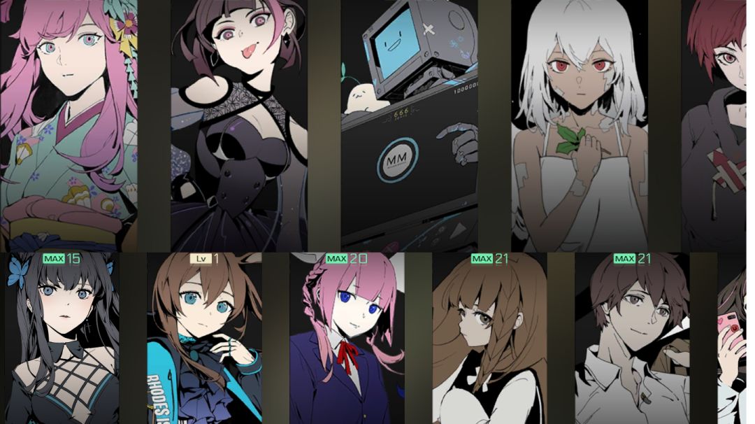 首先,老老实实地把新手教程过完,认识并尽可能地记住不同按键要怎么处理。 需要注意的是:向任意方向滑动的滑键只有混沌(CHAOS)和混乱(GLITCH)难度才有,对于新手而言不用刻意去记;你前中期需要处理的按键只有三种:单点、长按、滑锁链。 之后,带你认识一下界面: 如图,这是角色选择界面。 左下角的灰白按键点击后会退出到标题登录界面;红色按键点击后会进入黑市界面,黑市界面中左边是抽奖系统,右边是