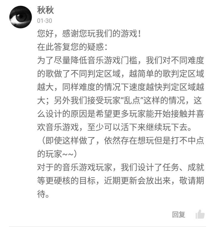本身不准备发评价也不准备发帖子只想吃瓜,可是官方的发言我真的受不了。下面就进行一下分析,当然这只是我一家之言,如果有不赞同的欢迎来友好交流音游的门槛不是扩大判定区域就能降低的,接受玩家“乱点”(俗称“糊”)就偏离了音游的本质。音游的乐趣就在于跟着音乐打节拍、note与节奏的完美结合。(官方真以为任务、成就是音游的核心吗,铺面屑到根本没有任何节奏)可是您游这样完全叛离音游本质的游戏在新鲜感散去