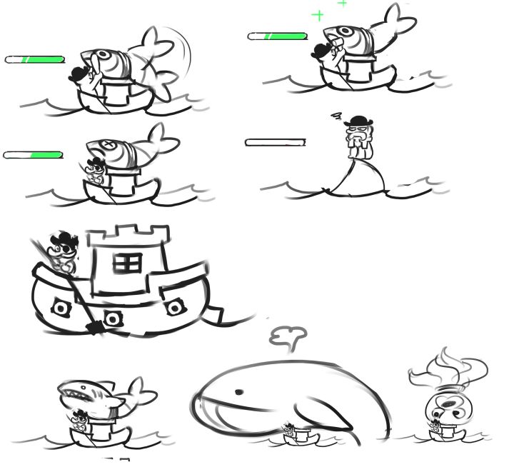 首先,我们要致以歉意。我们在《鱼咚哒》的玩法、音乐版权方面使用了错误的方式。并且,作为音乐“门外汉”,选择了对专业要求比较高的音乐游戏确实有些自不量力。关于《鱼咚哒》测试版,其创作起因是看到美术小伙随手画了一个草图,它长这样:主创人看到草图以后觉得,哎呀好可爱,大鱼和小船体型差好萌,我们要不要给这条大鱼赋予生命呢?它一定很有趣。于是,我们打算做一款玩法非常轻量的小游戏。比如点点点,打打打