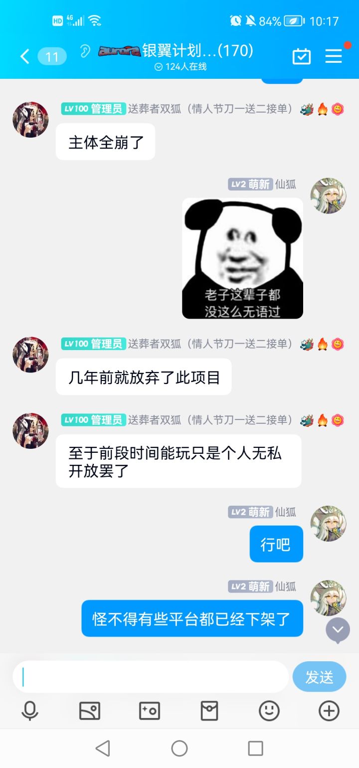 《银翼计划》2020年11月27日上线,2023年6月15日关闭注册功能,6月17日关闭下载功能,将于6月30日关闭服务器,请各位局长谨慎充值,并尽快将游戏内充值消耗完。曾经一群热爱二次元的玩家和一位热爱二次元的老板,呕心沥血3年时间,投入数千万,共同研发了《银翼计划》游戏,但因团队能力有限,游戏行业竞争激烈,不能做出令各位局长满意的游戏。经慎重考虑,忍痛关闭《银翼计划》游戏。感谢各位局长2年多的