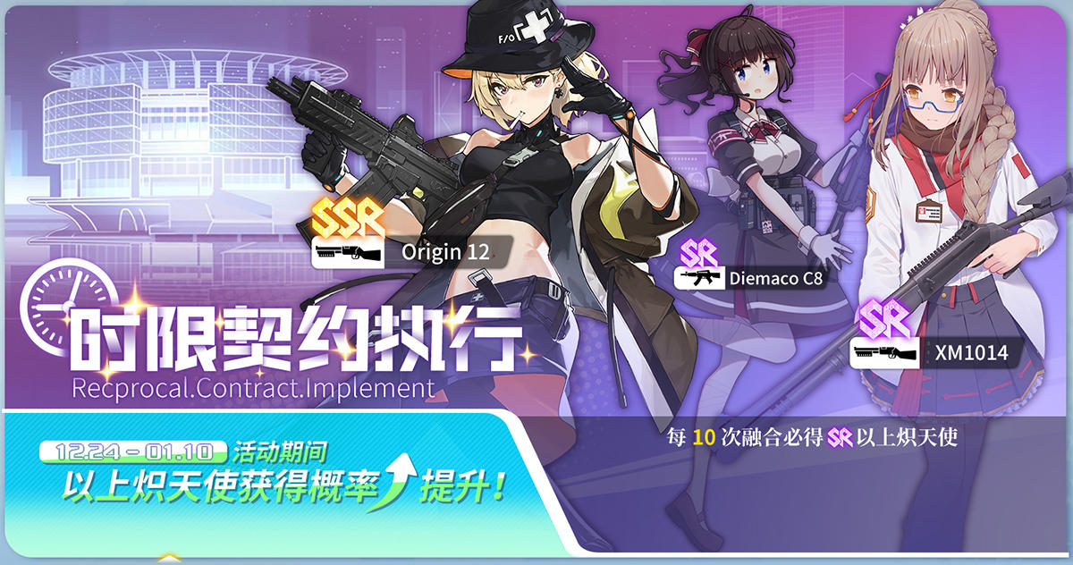 #银翼计划#【时限.契约.执行】新角色融合起止时间:12月24日~1月10日融合开启期间,以下角色获得概率提升SSR:Fostech Origin 12SR:XM1014SR:Diemaco C8