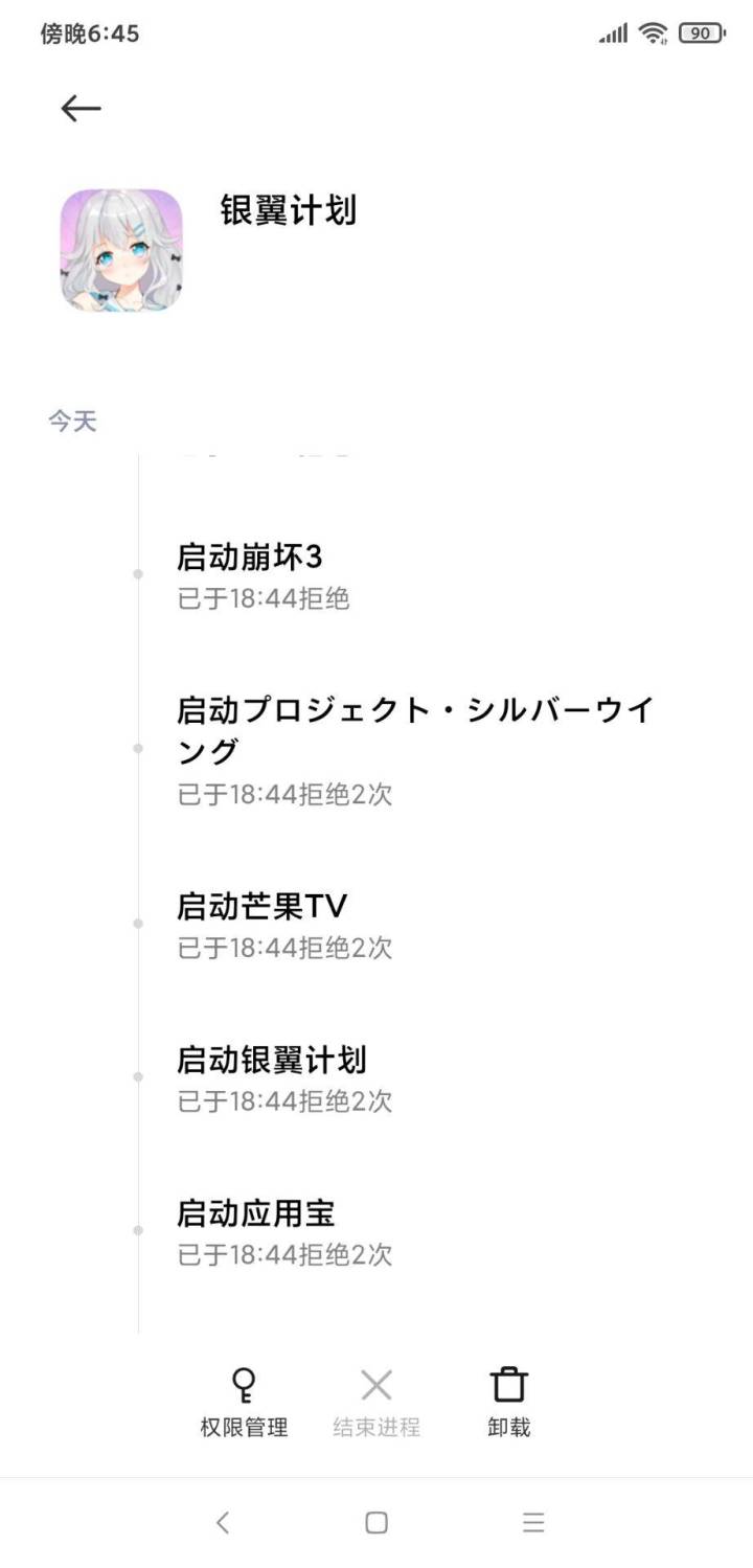 检查后发现小米手机(不排除有其他系统机型),是存在有这个显示情况,给广大玩家造成误解,为此银翼官方向大家深表歉意。但经核查实际上游戏并没有进行与显示信息相关联的启动调用,请广大玩家可放心进行游戏,如果真的很担心也可以把游戏全部权限都关掉(保留存储权限即可),但是仍然会显示相关启动行为记录┭┮﹏┭┮目前初步判断问题源于部分非原生安卓系统的应用行为记录功能,可能把某个安卓系统通用的推送行为误判为启