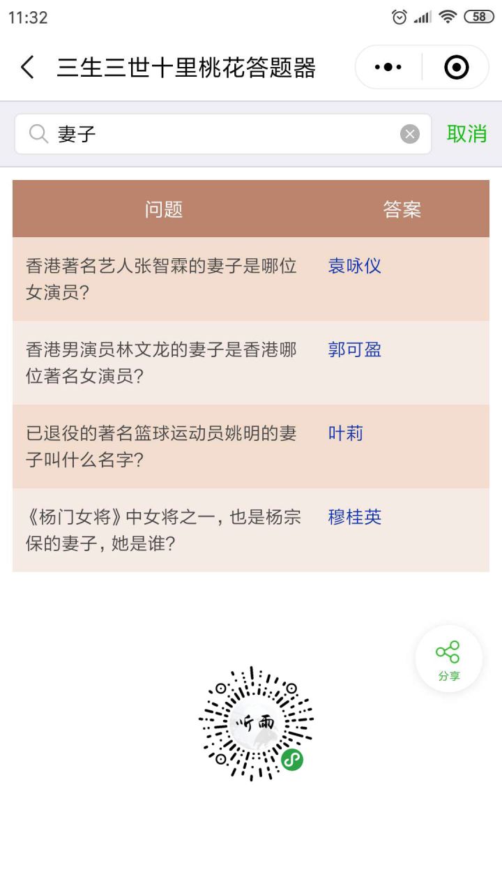 游戏中每天都有答题活动,不仅包含游戏常识、小说剧情,而且还有很多影视、历史、诗词等相关的题目,做了一个小工具,方便查找答案只需要输入关键词即可,不需要把问题全部输完,比如:“香港男演员林文龙的妻子是香港哪位著名女演员?”只需要输入“妻子”即可微信小程序搜索“听雨游戏工具箱”就能使用,也可以扫码图片中的二维码(当然选第二种方法)