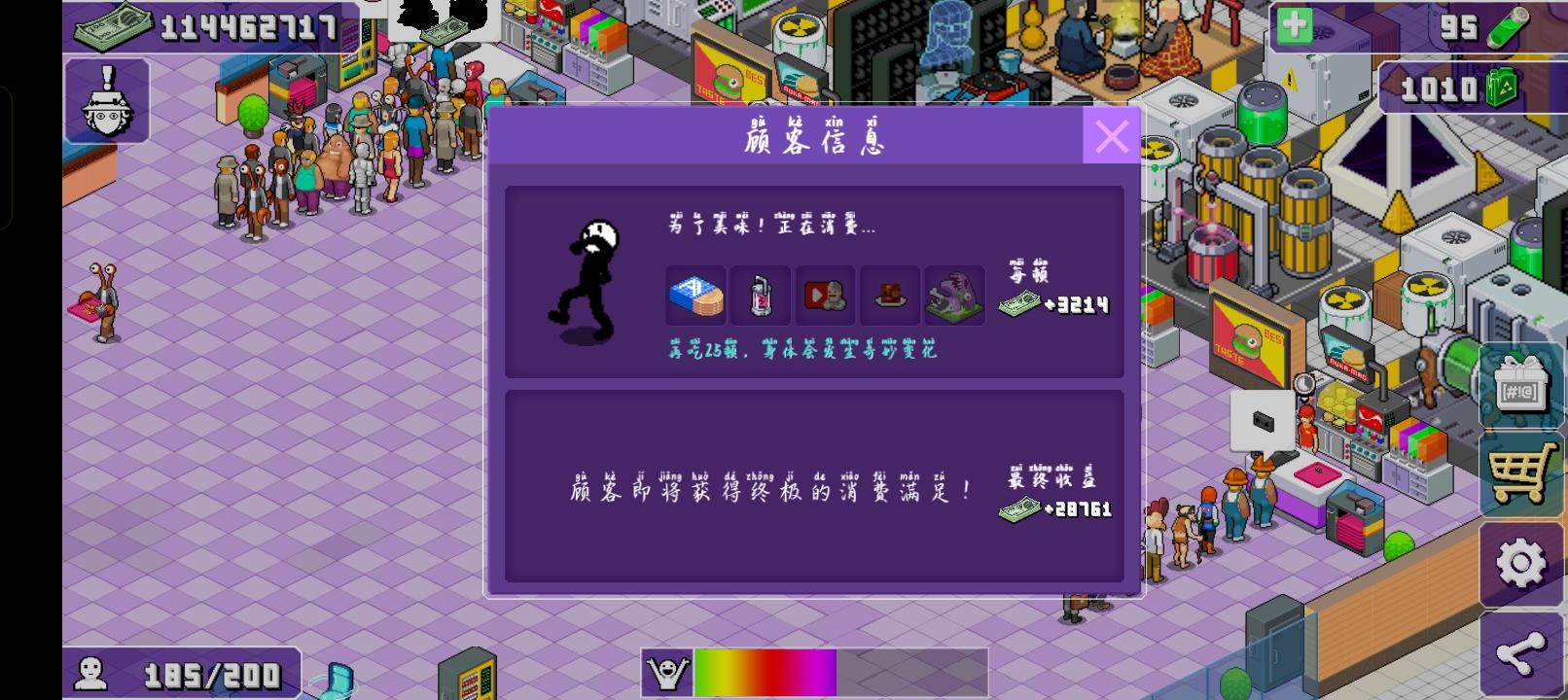 游戏画面音乐都挺不错的,很新颖,像素风格。从当老板开始白手起家,看着顾客垃圾食品上瘾到后面逐渐怪物化,感觉在暗讽现实中的小作坊。是养老挂机,每天上线收收钱升升级就行,我是跟着论坛前几年大佬们的攻略