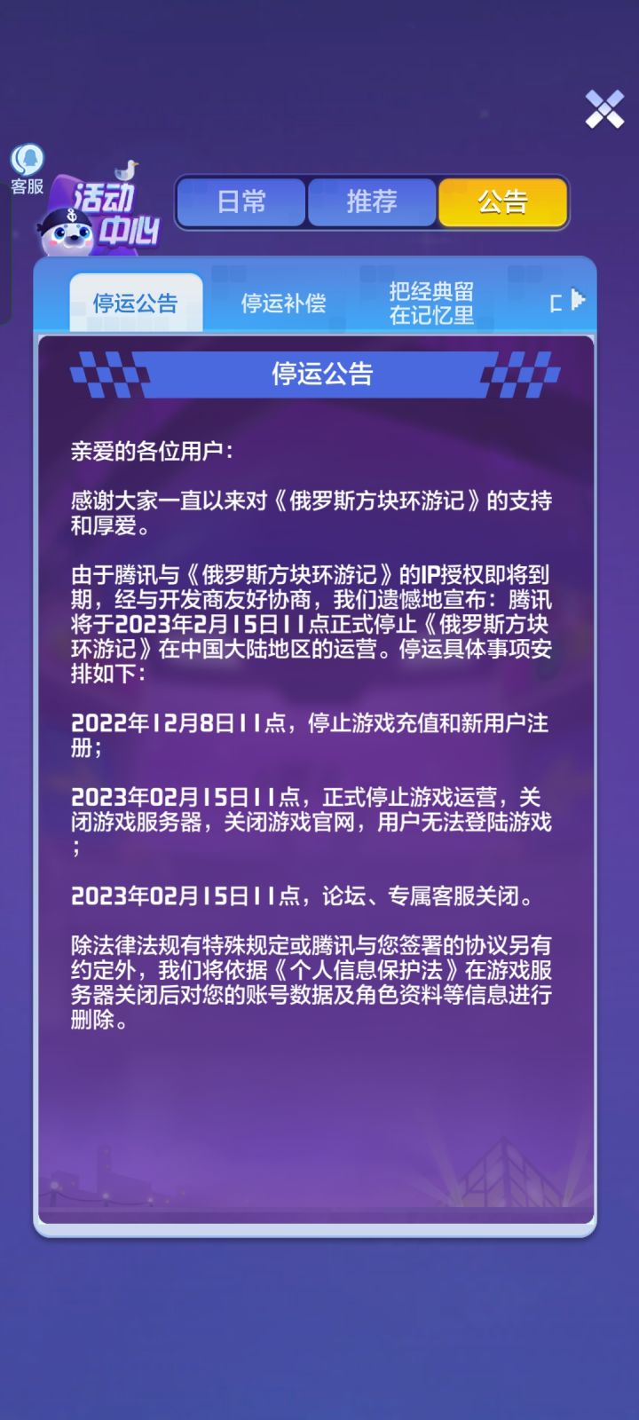 亲爱的各位用户:感谢大家一直以来对《俄罗斯方块环游记》的支持和厚爱。由于腾讯与《俄罗斯方块环游记》的IP授权即将到期,经与开发商友好协商,我们遗憾地宣布:腾讯将于2023年2月15日11点正式停止《俄罗斯方块环游记》在中国大陆地区的运营。停运具体事项安排如下:2022年12月08日11点,停止游戏充值和新用户注册;2023年02月15日11点,正式停止游戏运营,关闭游戏服务器,关闭