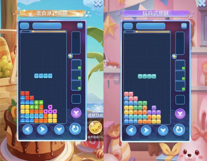 炎炎夏日,七块儿最喜欢做的事情就是和特趣思岛的小伙伴们一起举行夏日派对,畅享美食精彩,亦或是在夏日的夜晚遥看天上璀璨的银河,和大金牙他们一起数星星。如今,《俄罗斯方块环游记》也开启了全新模式,不仅有新皮肤新主题奉上,还有各种流光溢彩的拖尾,让方块玩家们一起尽享夏日之乐!多种可爱皮肤,让你无法拒绝夏日最不可或缺的必然是各种美食,它们也同样是七块儿一路闯关赏景的必备口粮。美食派对皮肤使用糖果、蛋糕