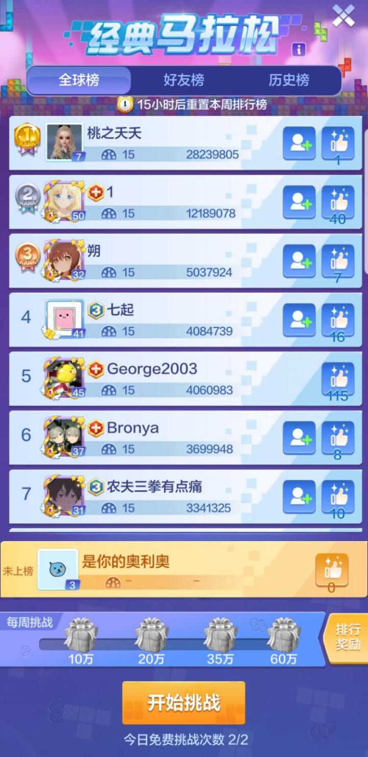 方块世界即将迎来了《俄罗斯方块环游记》S2赛季的收官之战,各个排行榜将在本周日晚24点准时结束。七块儿作为特趣思岛大喇叭在本赛季进行了众多赛事跟踪。方块战事如火如荼,你方唱罢我登场,但值得庆幸的是七块儿所仰慕大神始终都排在榜单前列,果然大神的姿势就是这么一如既往的帅无敌。大家快点排排坐好,七块儿要播报最新赛事战况啦!马拉松排行榜七块儿是个擅长耐力的人,以挑战自我极限而生的马拉松,就是七块儿的最