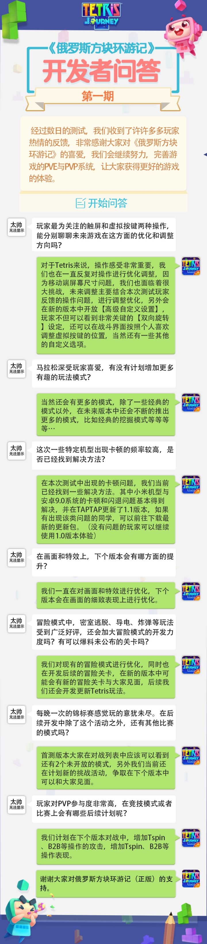 随着测试的稳步进行,大家在论坛、Q群、微信中反馈了许多对《俄罗斯方块环游记》这次游戏的看法、建议和BUG。而且从这些反馈来看,小伙伴都是从积极正向的角度来沟通表达。开发小组成员们深深的被大家正能量态度所感染,决定开创这个新的问答栏目——【问答有料】形式:收集小伙伴们反馈焦点问题,或关注内容进行答疑解惑与讨论目的:直面出现的问题,同步目前的开发重点,分享未来的开放方向以下就是本期的具体内容,