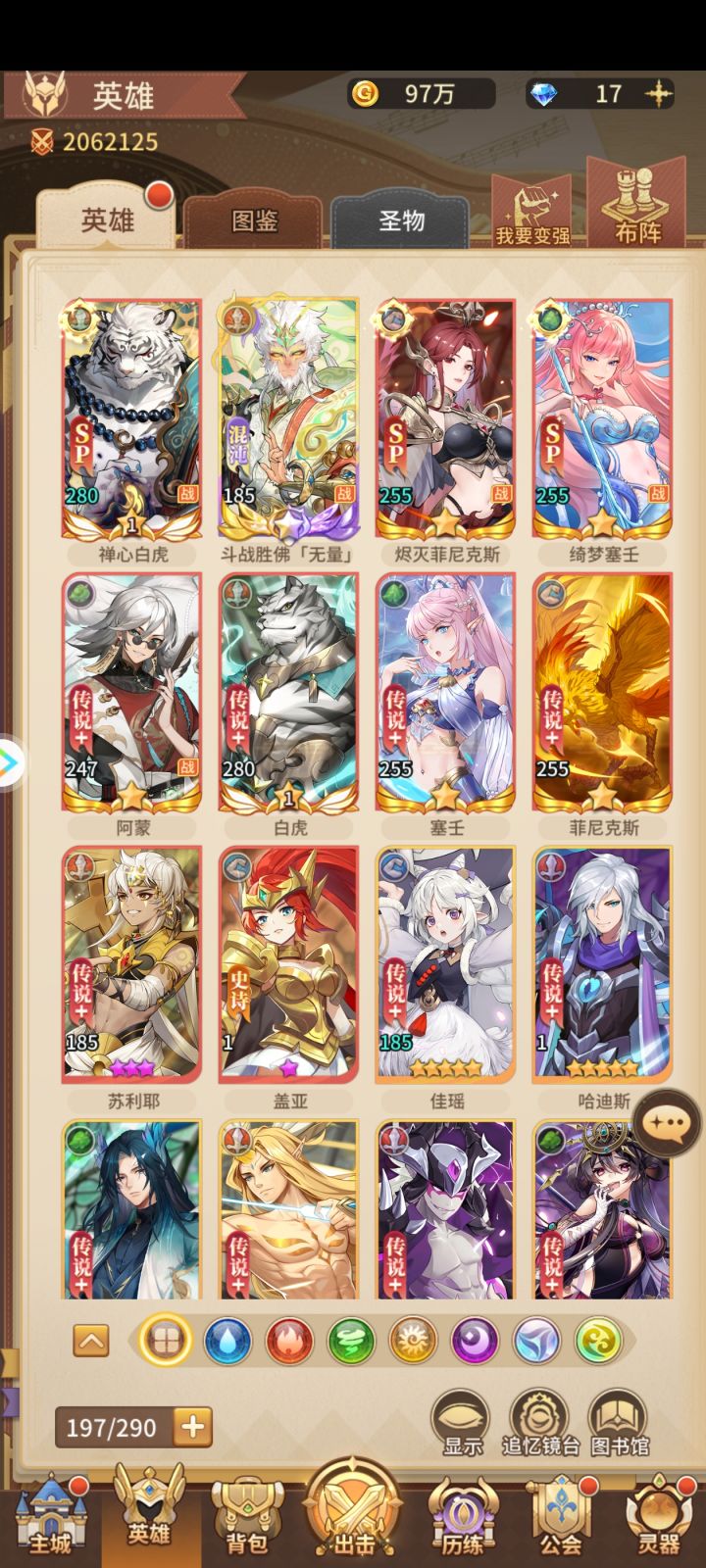 阵容如图,魔械师、sp白虎、sp熊猫、苏立耶、玄武,六人上冰雪女王抢速或者盘古、白泽、麒麟(能嫖到的话)。马上要出专服了,新手朋友们可以等专服重新玩个号,按照往期惯例,开服第八天会有松果活动,花5-6w钻石即可拿下一只sp虎,sp虎的强度在零氪微氪中氪里算很高的了,除了光法都能碰瓷一下。前期资源主堆老虎,竞技场积分可以攒着换老虎,后面换玄武、苏立耶,先知羽毛也是按照这个优先级,前期没有魔械、s