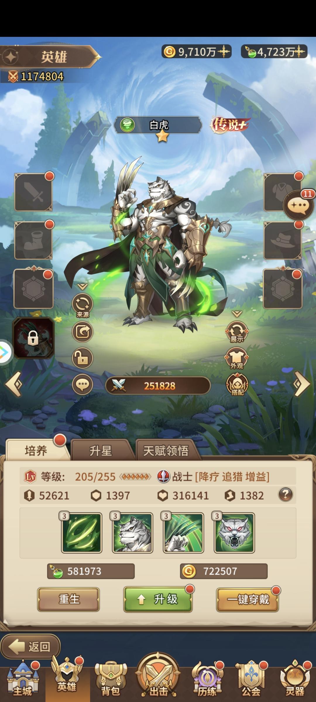 阵容如图,魔械师、sp白虎、sp熊猫、苏立耶、玄武,六人上冰雪女王抢速或者盘古、白泽、麒麟(能嫖到的话)。马上要出专服了,新手朋友们可以等专服重新玩个号,按照往期惯例,开服第八天会有松果活动,花5-6w钻石即可拿下一只sp虎,sp虎的强度在零氪微氪中氪里算很高的了,除了光法都能碰瓷一下。前期资源主堆老虎,竞技场积分可以攒着换老虎,后面换玄武、苏立耶,先知羽毛也是按照这个优先级,前期没有魔械、s