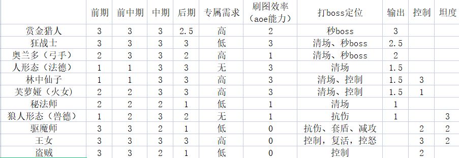 备注:由于主角,盾哥,牧师,死灵作用有限,表中就不列出了。表中3表示强势,1表示很弱。 时期划分标准如下: 前期:全是破烂装备,只能勉强优先保证一个核的输出,过BOSS很勉强; 前中期:有着一定输出和坦度,装备输出有一定的溢出,C位能够先手,副C速度不高,雷鸟概率不高(一般这时候赏金有专属); 中期:坦度已经开始不够看,除了野兽德没人顶得住,副C输出足够秒小怪但秒不了BOSS,雷鸟概率90%,行动