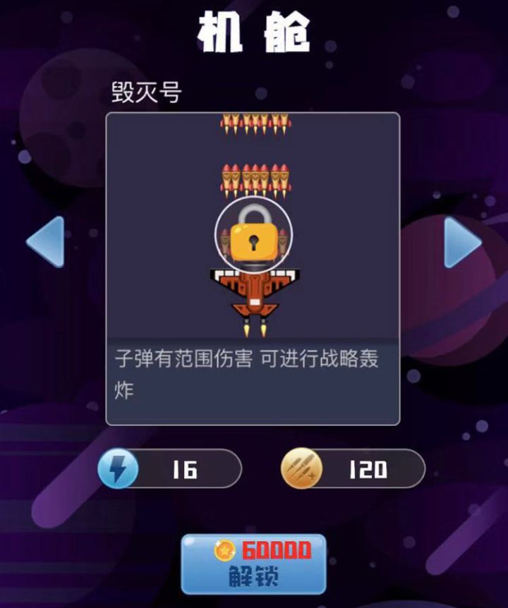 毁灭号:子弹射速慢,左右密集且不扩散,前后排的间隔较大。技能是进行战略轰炸,发动带盾牌首先说说,个人觉得毁灭号是所有机型里面技能施展范围最广的了,破坏力也不错,并且值得一提的是他的子弹是带有范围伤害的,可以说是性价比最高的一款机型了。前期射速不算高,但是比激光号高就对了,如果说要入手散发者,不是收集癖的话,我宁愿存久点钱来入手毁灭号是真的。
