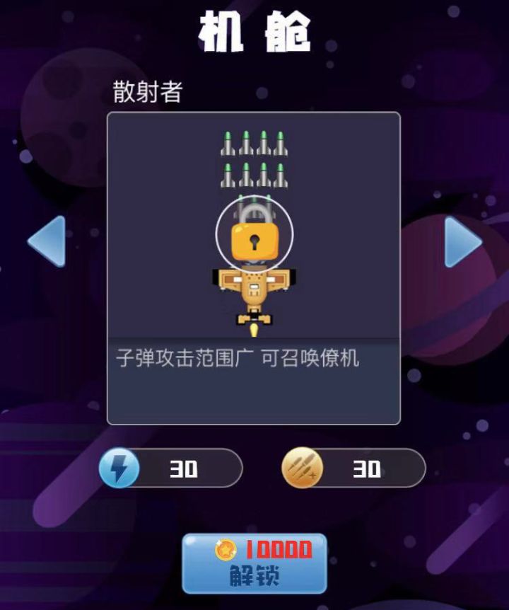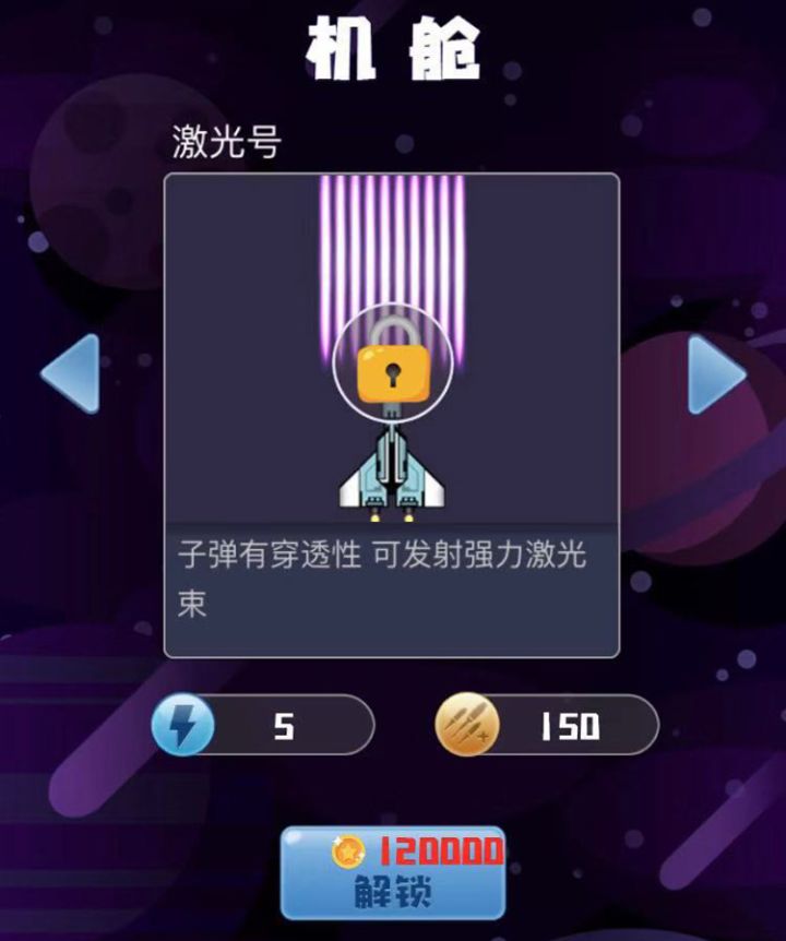 激光号:子弹射速慢、不扩散、具有穿透性,左右超密集,前后排间隔密集。技能是发射强力激光束,发动带盾牌这款飞机的左右间隔应该可以说是最密集的之一了,它的射速很慢不过并没有关系,因为它的子弹是有穿透力的,飞机的性能不错,初期攻击力也很高,技能发动的时候是一束很强力的激光束,穿透全屏。总的来说不缺钱的话入手是不错的。