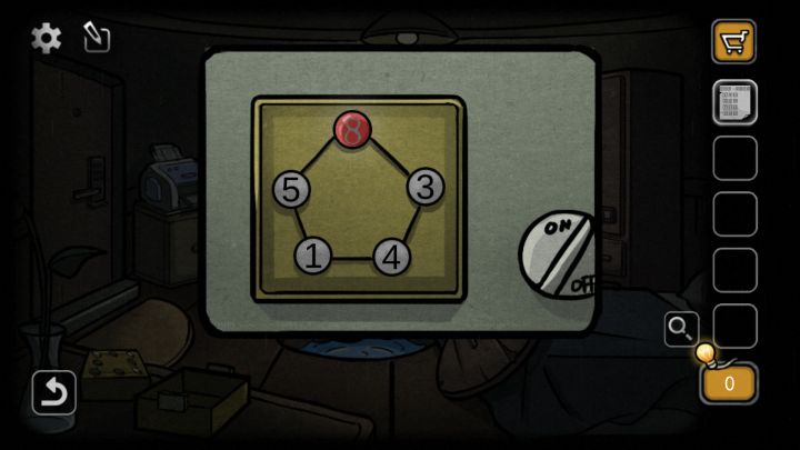 第一关:点一下地板中间的钓竿,得到一条鱼。出门,点击左上角的鸟窝,喂鸟吃鱼,得到钥匙。回到房间对电视下面的柜子使用钥匙,获得望远镜的镜头。出门,把镜头装在望远镜上,看到如图画面。记住图标顺序,回到房间。点击电视左边的照片墙。(树、鸟、柜子、人)得到螺丝刀。点击电视右边的圆形物体,使用螺丝刀打开。按图中右边部位的样子点击圆形物体中间的按钮。获得一卷钞票。出门选择望远镜右边的东西,