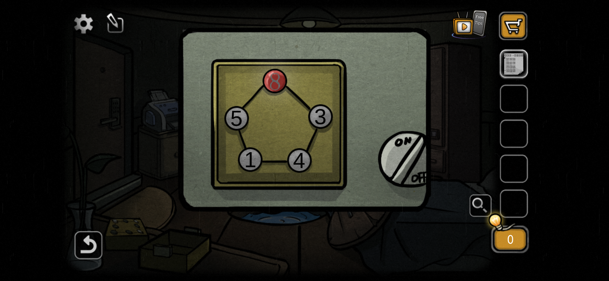 第一关:点一下地板中间的钓竿,得到一条鱼。出门,点击左上角的鸟窝,喂鸟吃鱼,得到钥匙。回到房间对电视下面的柜子使用钥匙,获得望远镜的镜头。出门,把镜头装在望远镜上,看到如图画面。记住图标顺序,回到房间。点击电视左边的照片墙。(树、鸟、柜子、人)得到螺丝刀。点击电视右边的圆形物体,使用螺丝刀打开。按图中右边部位的样子点击圆形物体中间的按钮。获得一卷钞票。出门选择望远镜右边的东西,